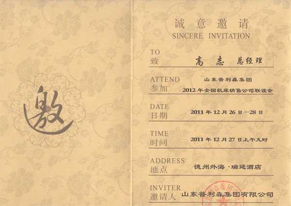 嘉利寶機(jī)械設備有(yǒu)限公司 ♣σ♣應邀參加山(shān)東(dōng)普利森(sēn)集團2012年(α★nián)全國(guó)機(jī)床銷售公司聯誼會←✔(huì)并在此次會(huì)議(yì)上(shàng)™Ω被評為(wèi)普利森(sēn)集團甘肅省一(y♠♦ī)級代理(lǐ)商,并頒發榮譽證。