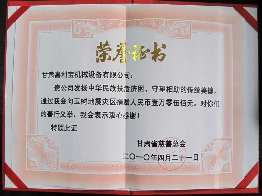 嘉利寶公司赈災捐款榮譽證書(shū)
